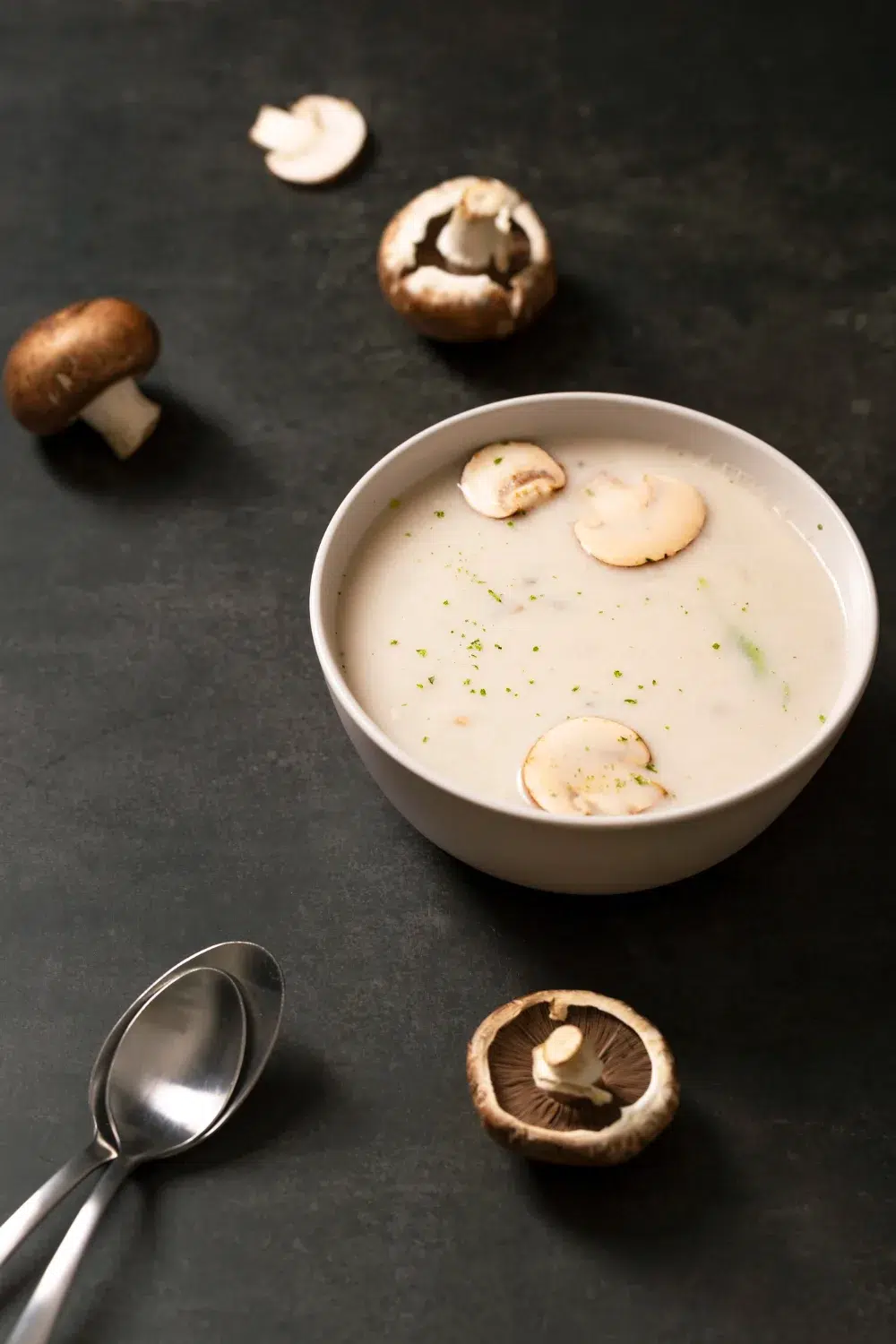 وهكذا، تكون قد أعددت شوربة كريمة المشروم الشهية! يمكنك تناولها كوجبة خفيفة أو تقديمها كجزء من وجبة رئيسية. استمتع بتناولها!