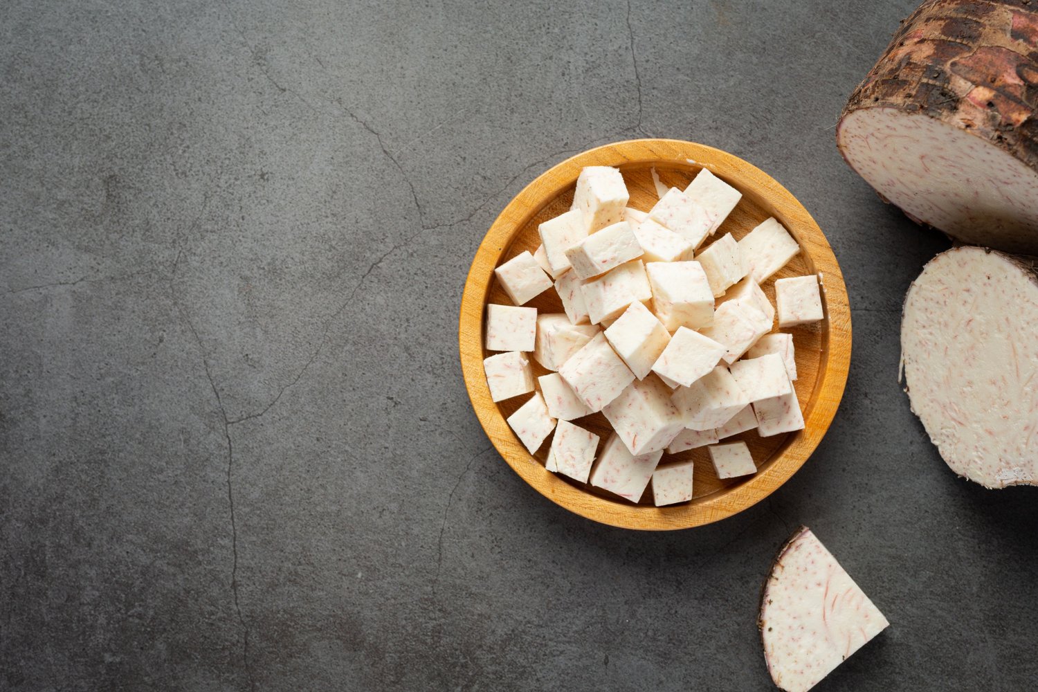 5. بعد تقشير القلقاس، قم بتقطيعه إلى قطع صغيرة بحجم ملتوي أو قطع مكعبة، حسب الاستخدام المفضل لك.
