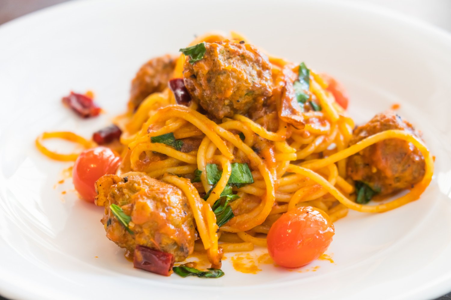 10. قم بوضع كرات اللحم وصلصة الطماطم فوق المكرونة وقدمها ساخنة.